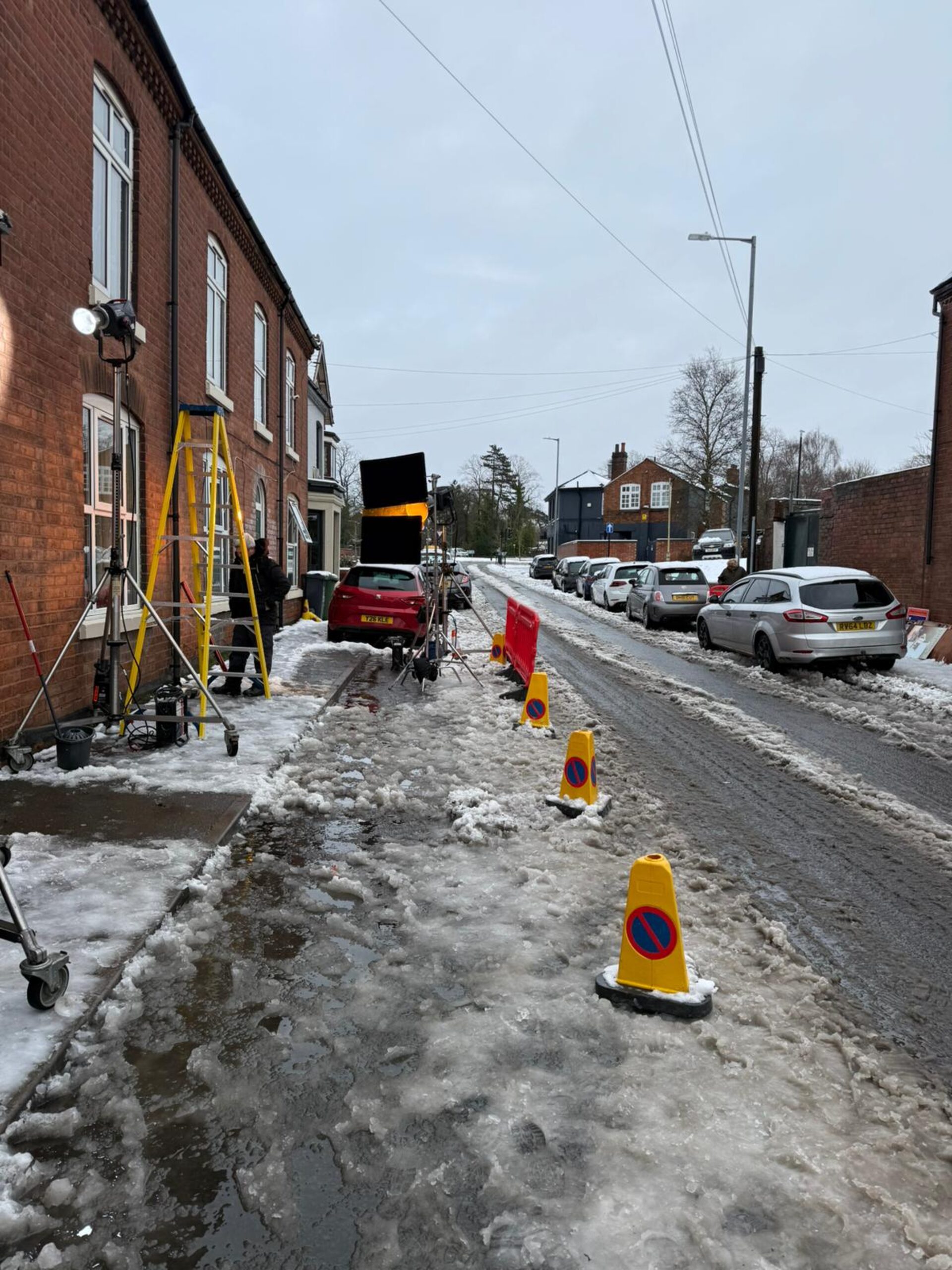 The January night shoot on The Butts coincided with heavy snowfall, turning the period-dressed street into something otherworldly. The crew kept filming.